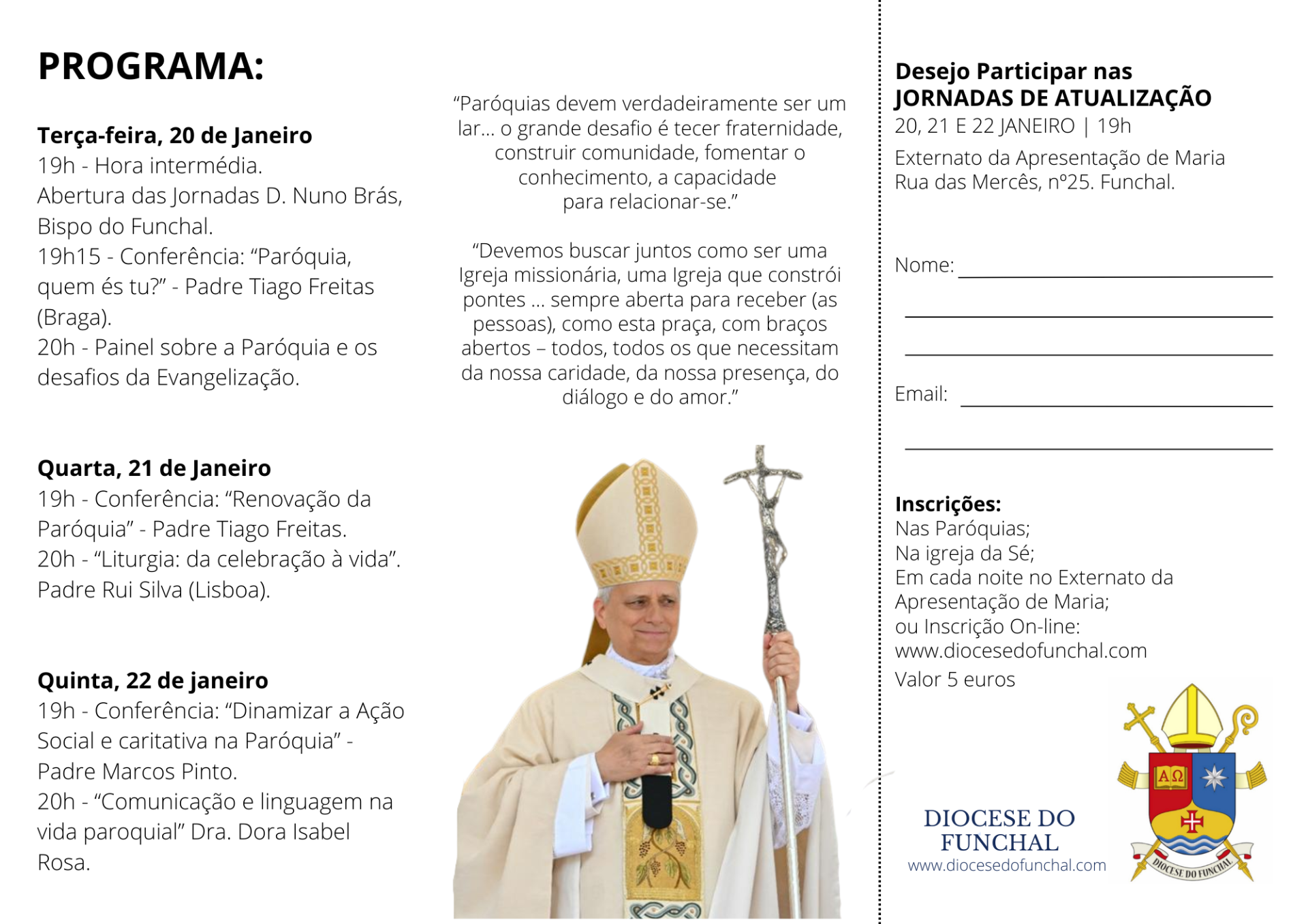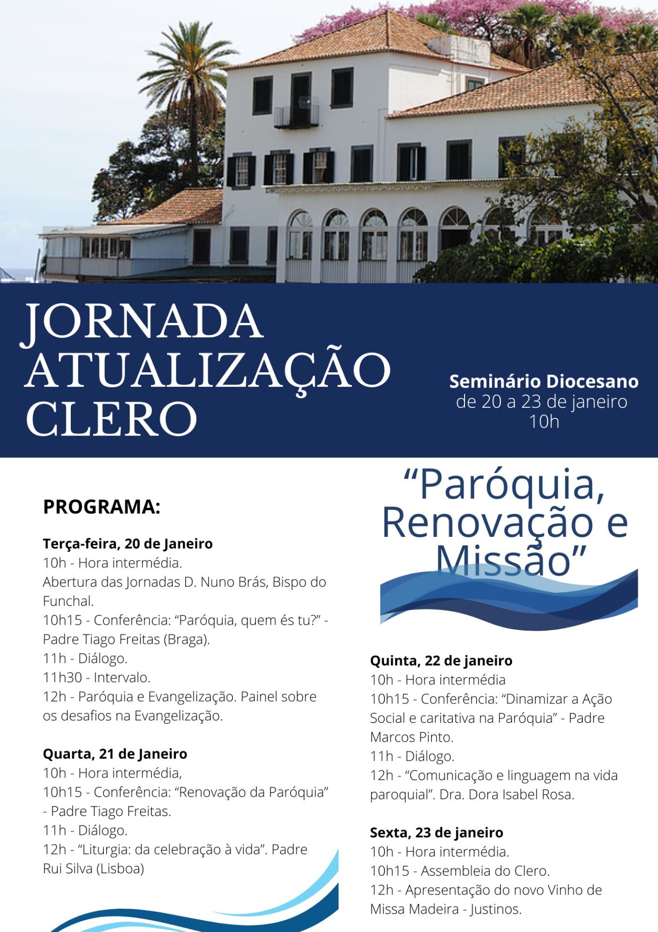 De 20 a 22 de janeiro a Diocese do Funchal promove as Jornadas de Atualização para o Clero, Leigos e Consagrados. As conferências deste ano terão como tema: "A Paróquia, Renovação e Missão".