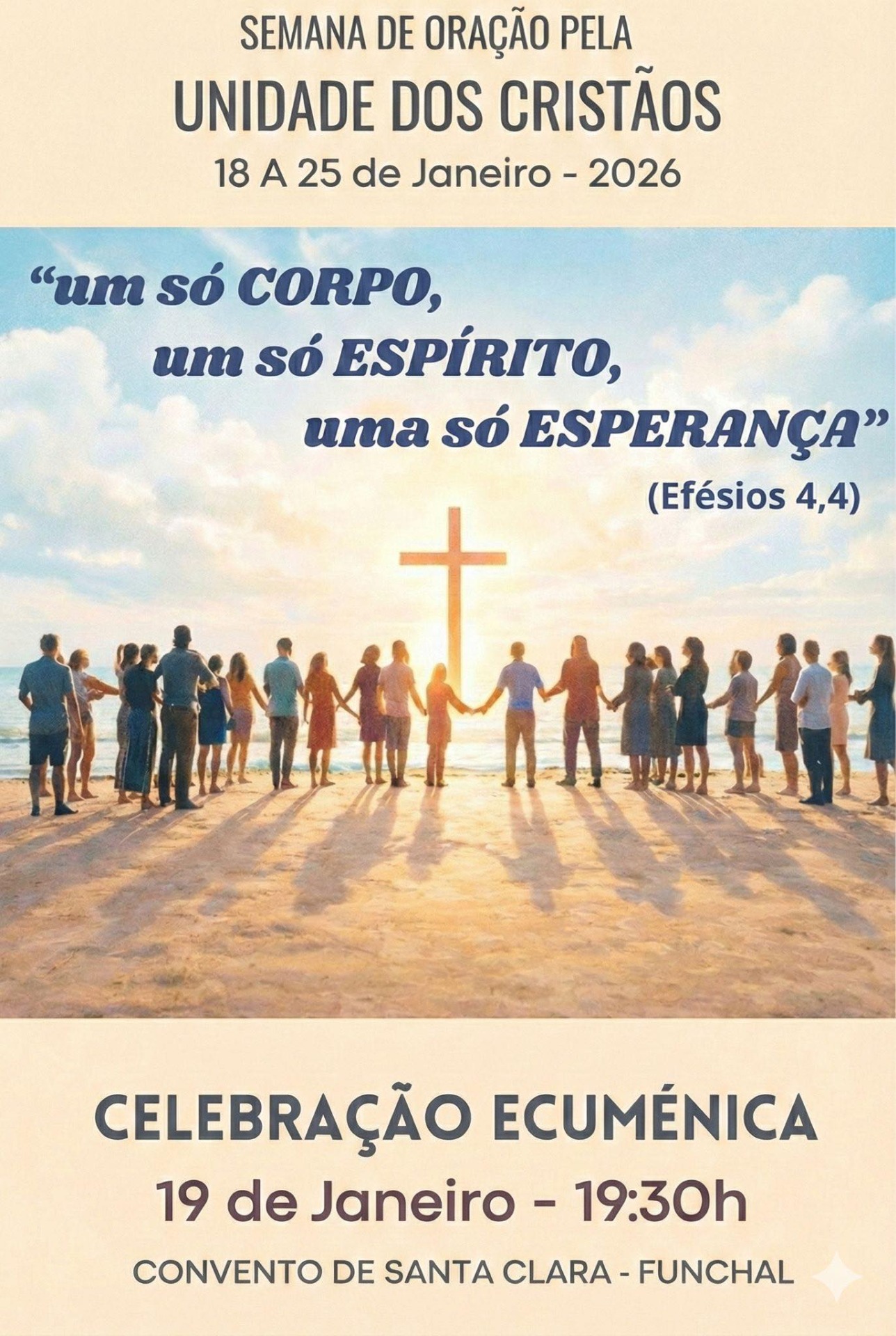 A Diocese do Funchal assinala a Semana de Oração pela Unidade dos Cristãos (18 a 25 de janeiro) com uma celebração ecuménica no dia 19 de janeiro às 19h30, no Convento de Santa Clara. É um momento de oração comum com a Igreja Luterana, Presbiteriana, Anglicana e Ortodoxa presentes na Diocese. Esta celebração será o momento alto desta semana, convidando todas as igrejas cristãs a participar e a renovar o compromisso com a unidade.
